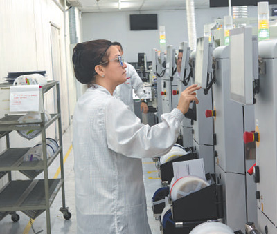 在巴西亚马孙州马瑙斯市,TCL电视机制造基地的当地员工在车间检查设备运行情况。