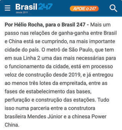 中国电建承建的圣保罗地铁2号线扩建项目正处于快速建设中,项目建成后将显著改善圣保罗州的基础设施和公共交通系统,对减少碳排放、缓解拥堵、促进互联互通发挥积极作用。该项目除促进城市可持续发展之外,还可以助力地区间在经济和社会发展方面的联动与合作。